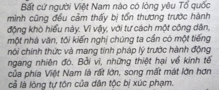 Trong công cuộc xây dưng và giữ nước, đội ngũ nhà văn chúng ta đã đồng hành cùng nhân dân, cùng chiến sĩ. Hôm nay Tổ quốc đang đứng trước sự đe dọa vẹn toàn lãnh thổ, nhà văn chúng ta cần có tiếng nói cùng nhân dân. Báo Văn nghệ số ra ngày 4-6-2011 đã có tiếng nói của nhà thơ Phạm Đương và đó là tiếng nói chung của giới văn nhân chúng ta. Hoan hô báo Văn nghệ !